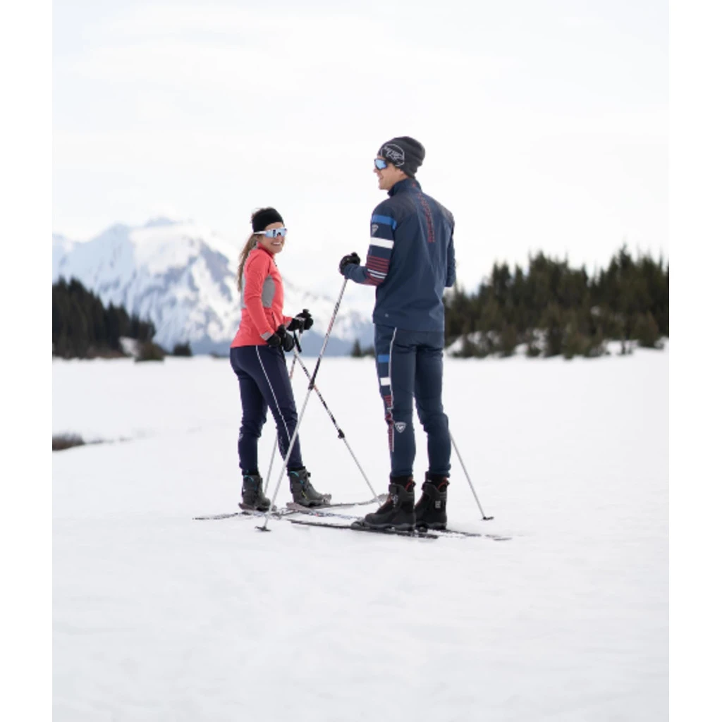 The designs on the legs are unique to the brand, echoing Nordic skiing and the tracks left by those dedicated to this classic practice, as well as by snow groomers leaving subtle prints over fresh snow.