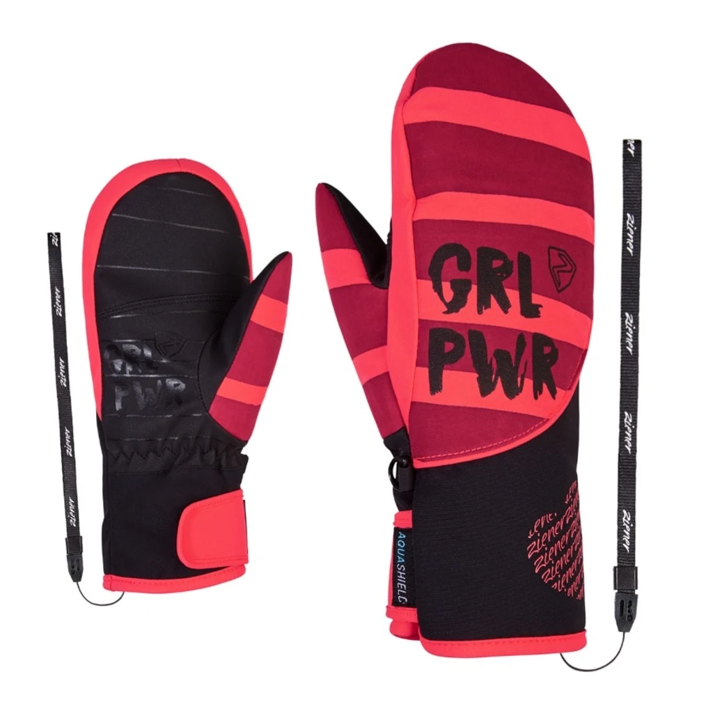 The printed palms provide optimal grip on the ski poles. Wide Velcro straps make it possible to wear the gloves under jacket sleeves. The gloves can be secured to the wrists with the Z-leashes. The fashionable, striped look with the cool lettering provides an extra serving of GIRL POWER! The product contains recycled material – for a resource-saving approach to the environment.